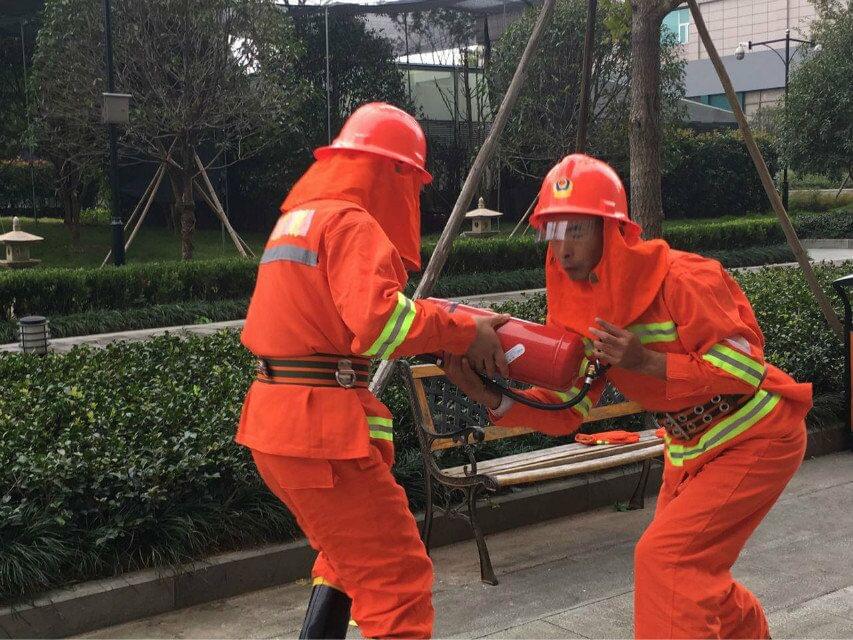 第一天首先進行的是商管組。商管組比賽內(nèi)容是4*100米接力滅火操作及二人二盤水袋連接出水操作。4*100米接力滅火比賽規(guī)則為第一名參賽隊員聽到預(yù)備口令時,在起點線做好起跑準備,另外3名隊員分別在100米處和起點線做好交接準備,輔助人員將油盆的火點燃。聽到起跑信號,第一名隊員立即拿起滅火器向前跑(第一次搶跑重跑,第二次再搶跑的不記取成績),到100米處將滅火器交給第二名隊員,其他隊員以此類推。第四名隊員攜帶滅火器跑至油盆區(qū),利用滅火器將油盆的火撲滅后沖出終點線。二人二盤水袋比賽規(guī)則為連接出水操作聽到“開始”的口令或信號,第一名隊員先甩開第一盤水帶,將一端接口交給第二名隊員,第二名隊員將水帶連接在分水器上,做好出水準備;第一名隊員攜帶水帶另一端和另一盤水帶向射水線跑動,在跑動過程中將第一盤的水帶接口與第二盤水帶進行連接并鋪設(shè)好第二盤水帶,動作完成后連接好水槍在射水線做好打靶準備,然后示意第一名隊員出水,待水槍出水后將靶打到。