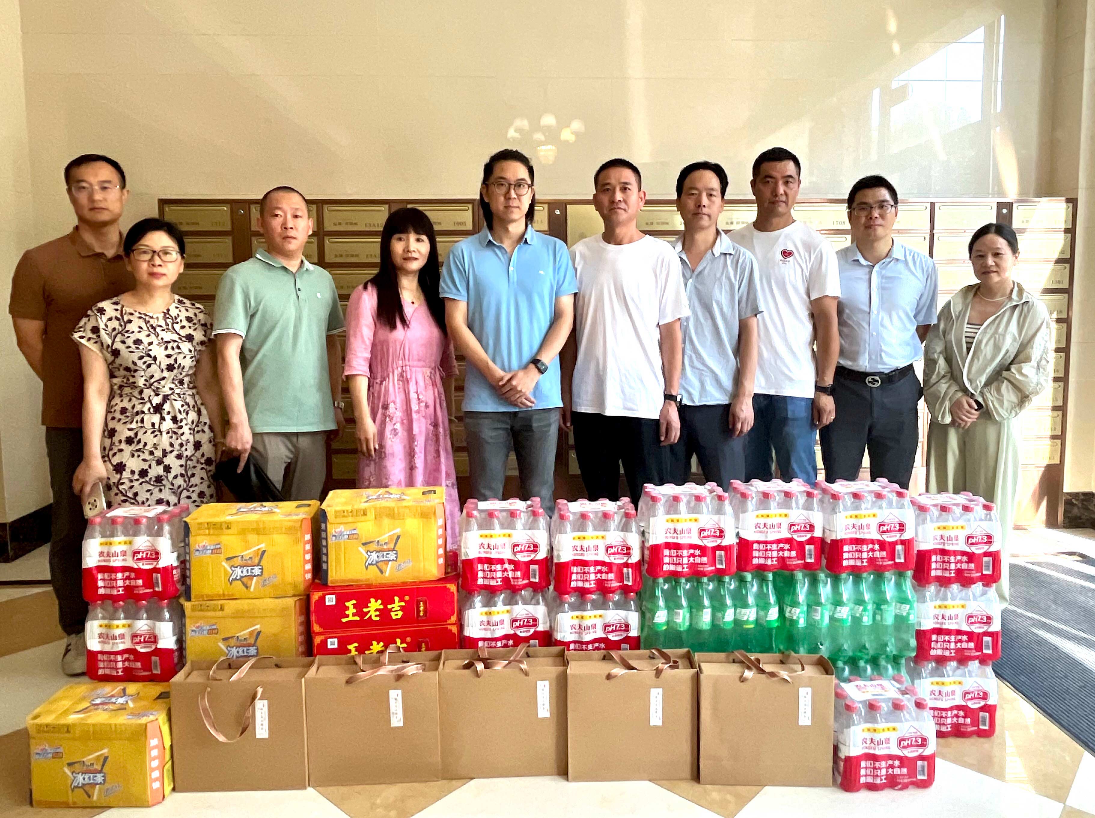 集團(tuán)高管層分三路慰問(wèn)近20家子公司。走訪中,集團(tuán)領(lǐng)導(dǎo)深入子公司生產(chǎn)場(chǎng)地,了解各家公司的生產(chǎn)任務(wù)安排和員工的作息排班情況?!按蠹倚量嗔?,高溫天氣一定要做好防暑降溫工作!”在高溫工作現(xiàn)場(chǎng),傅融總裁代表集團(tuán)向奮戰(zhàn)在一線的員工致以親切的問(wèn)候,并為他們送上冰紅茶、王老吉、礦泉水等清涼物資,對(duì)他們?cè)诟邷叵聢?jiān)守崗位表示感謝。傅總叮囑大家工作中要增強(qiáng)安全防護(hù)意識(shí),落實(shí)好防暑降溫措施,確保安全生產(chǎn),平安度夏。